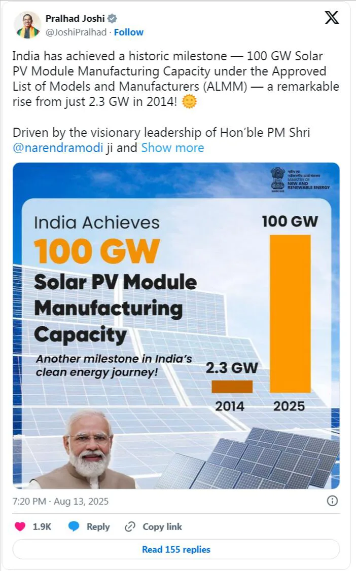 এই বছরের শুরুর দিকে, 2025 সালের ফেব্রুয়ারিতে, ভারত 100 গিগাওয়াট সৌর ফটোভোলটাইক ইনস্টল ক্ষমতার মাইলফলক অর্জন করেছিল, যা 2014 সালের 2.8 গিগাওয়াট থেকে 3450% বৃদ্ধি পেয়েছে।